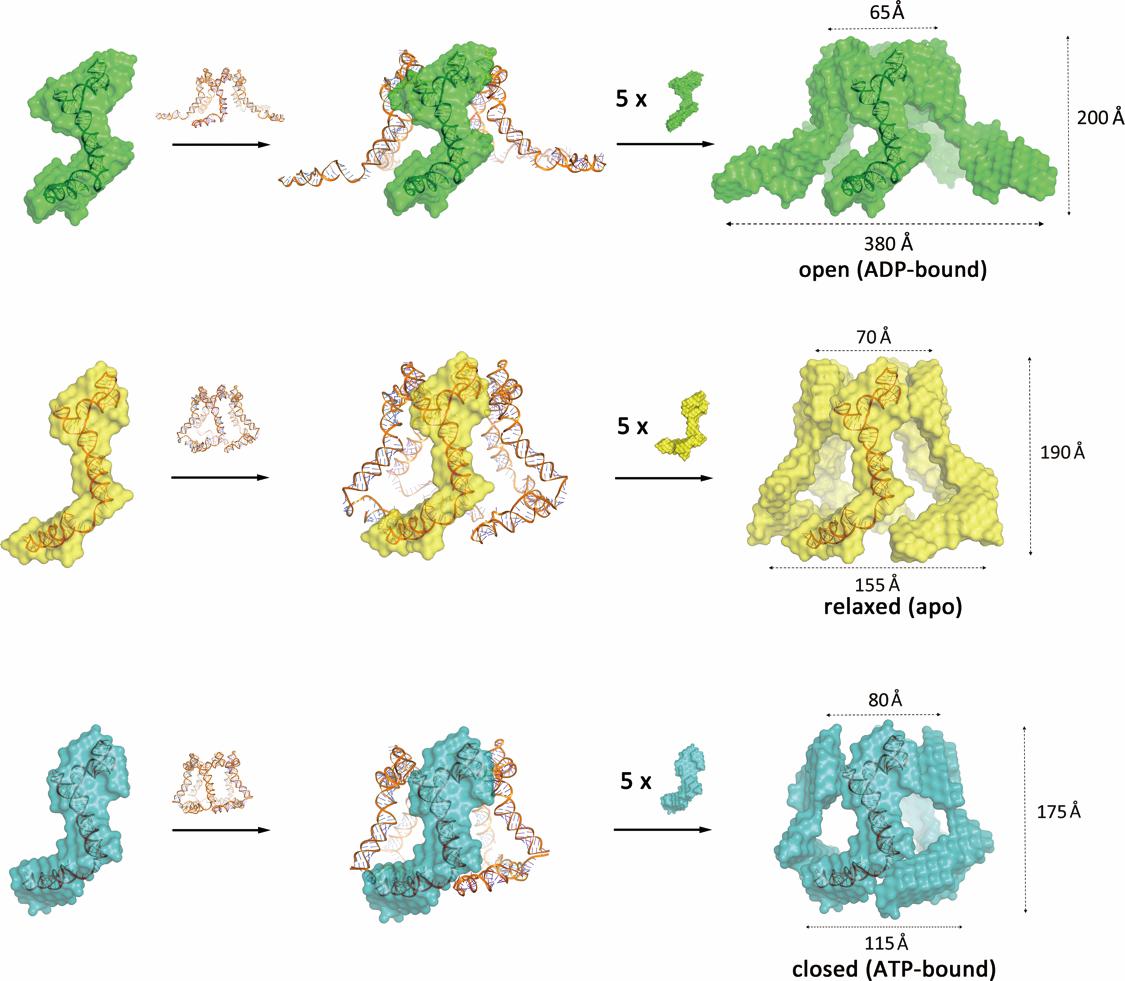 研究表明,包装马达末端核酸蛋白复合体pRNA-gp16特异性结合,组成“Z”形复合物。当ATP与复合物结合时,pRNA末端domain II向DNA通道靠拢,组成密闭桶状五元环结构;当ADP与pRNA-gp16复合物结合时,pRNA domain II向外侧移动。根据pRNA-gp16复合物在结合ATP/ADP前后所发生的构象变化进一步说明了pRNA末端在噬菌体包装过程中具有重要作用,可通过操控pRNA domain II的位置协助DNA的特异性识别并促进DNA运动。