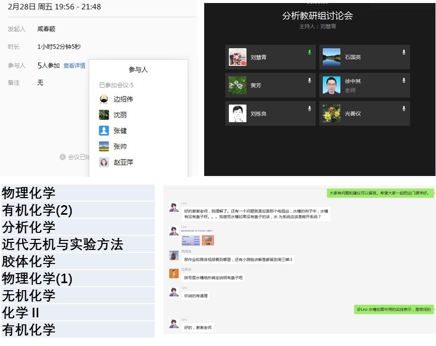 新冠肺炎疫情出现以来,全国人民在党中央、国务院的领导与指挥下,以疫情为命令,把防控当责任,坚决、坚定地打响了疫情阻击战。本学期化学部支部党员教师承担着我校化学化工、材料、环境等多个本科专业化学基础理论课程和实验课程的教学任务,时间紧,责任大,任务重。为了进一步响应“疫情防控,停课不停学,停课不停教”的号召,充分发挥基层党支部的战斗堡垒作用和党员教师的先锋模范作用,2020年2月25日化学部党支部组织开展了“抗击疫情,确保教学质量,党员教师在行动”的线上主题党日活动,支部书记边绍伟老师主持了视频会议,支部全体党员教师参加。