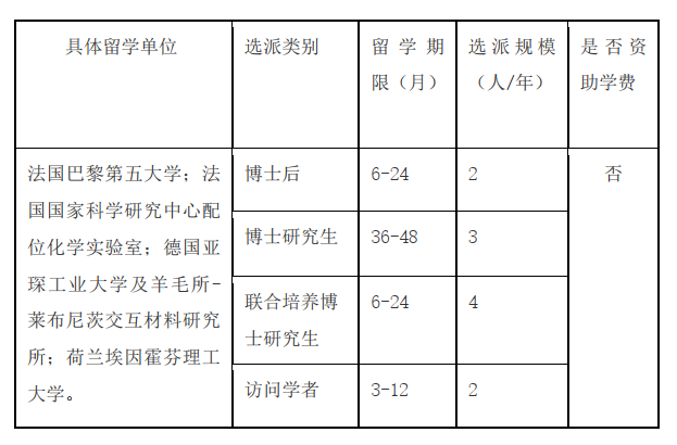 本项目为yl23411集团和法国巴黎第五大学(Paris Descartes University)、法国国家永利集团中心配位化学实验室(Laboratoire de Chimie de Coordination,CNRS)、德国亚琛工业大学及羊毛所-莱布尼茨交互材料研究所(RWTH Aachen University, DWI-Leibniz Institute for Interactive Materials)、荷兰埃因霍芬理工大学(Eindhoven University of Technology)合作的创新人才培养项目。项目依托中、法、德、荷高校在生物医学工程、生物化学与分子生物学、化学、生物材料学等学科领域的优势资源,面向国家重大战略需求,汇聚了一批国际学术大师和国内外研究骨干,旨在搭建具有引领示范作用的国际人才培养与合作交流平台。项目选派类别包括攻读博士学位研究生、联合培养博士生和访问学者(含博士后),国家留学基金委将资助项目人员往返国际旅费和资助期限内的奖学金。